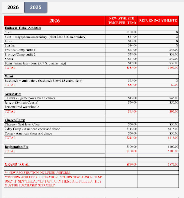 Breakdown Of Costs - If any questions please contact our Cheer Coordinator Gina McKinney - cheer@galtjrwarriorsyouthfootballandcheer.com