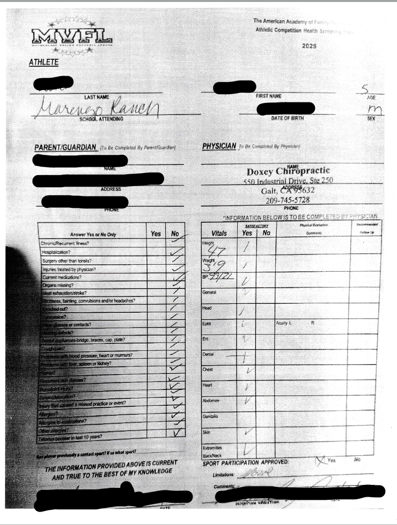 ***Physical forms must include the wording cleared for sports, cleared for athletic activity, or the box marked "SPORT PARTICIPATION APPROVED" on the MVFL physical form or associated doctors physical form. It also must include the doctors signature, written or digital, with the date.